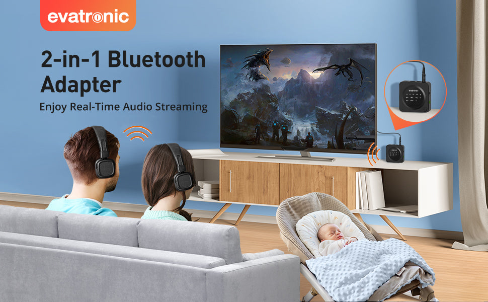 - Dual Connection: Whether in RX or TX mode, Evatronic Bluetooth audio adapter can be linked to 2 headphones or other Bluetooth devices simultaneously, you can enjoy movies, music with friends, families, and share precious fun time without disturbing others.