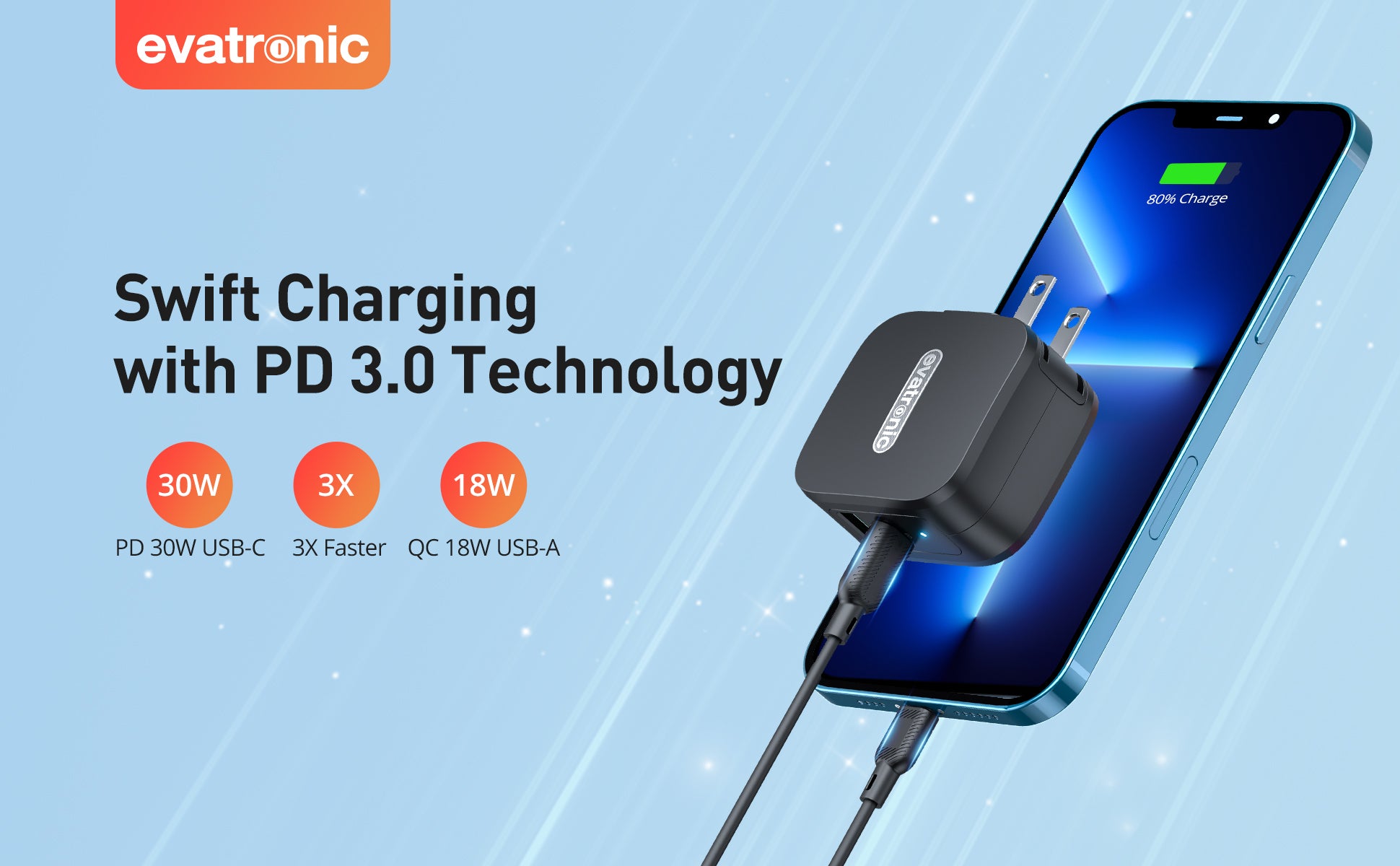 Supplying 30 watts of power across two USB-C ports, the Evatronic 30W USB-C Power Adapter is a great choice if you need to keep several devices ready to go. Enjoy fast, efficient charging at home, the office, or on the go.