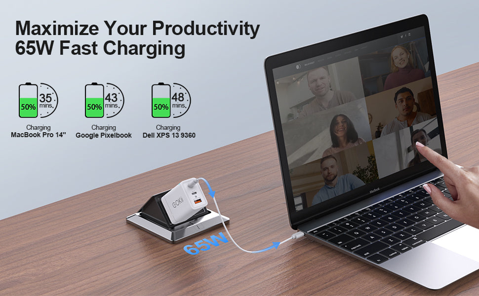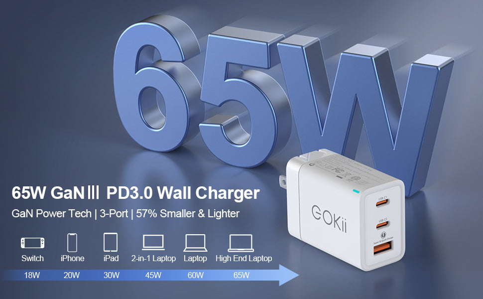 - ⚡[Super-Fast Charging] Connect a single device to get a 65W max charge - enough to power up a Macbook Pro/Air 2022 from 0% to 100% in only 2hrs. Eokii’s iconic PD 3.0 with PPS technology can provide high-speed charging for most mobile devices.