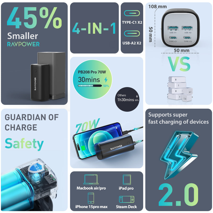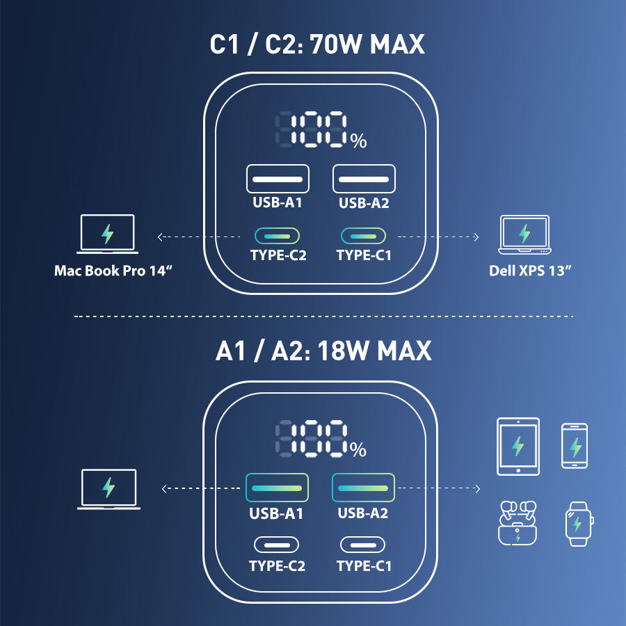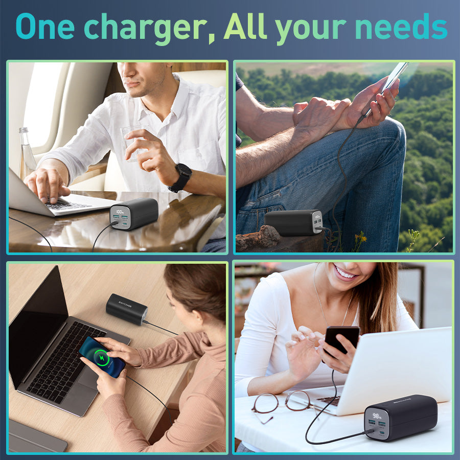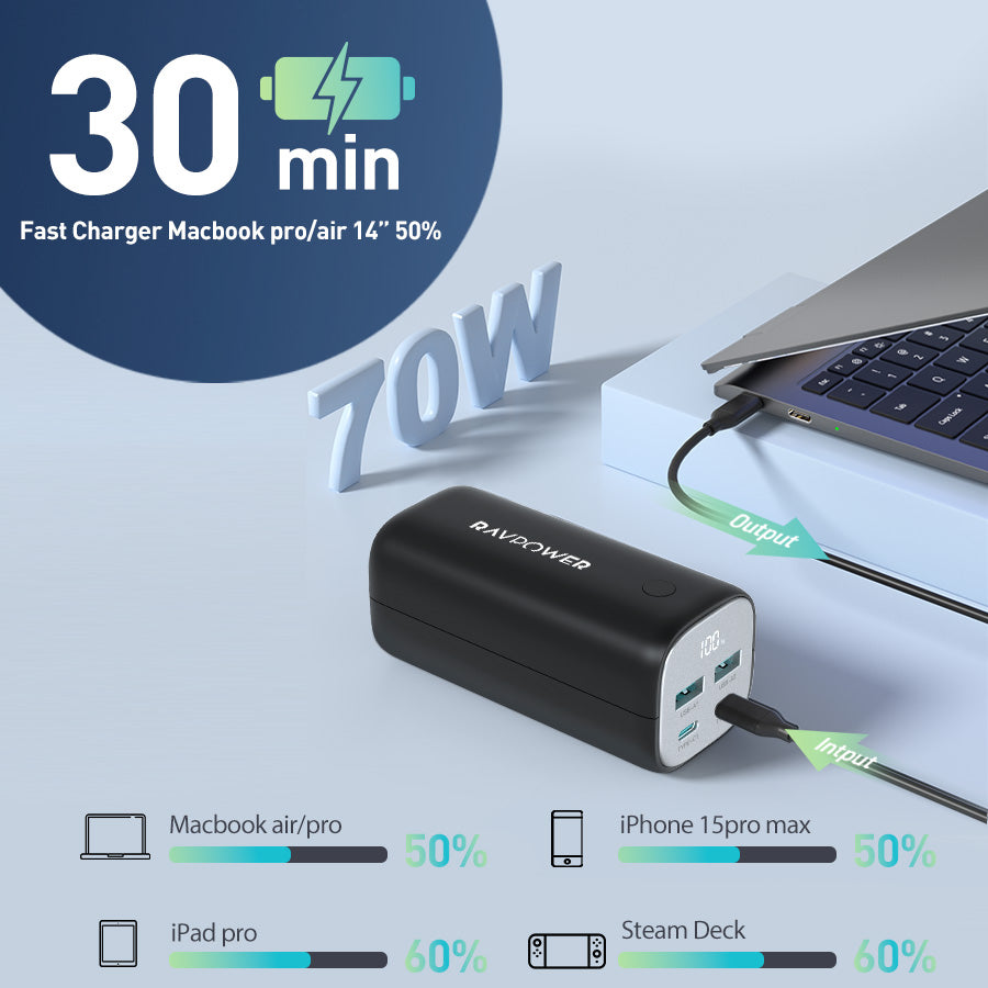 70W Two-Way Fast Charging: The USB-C output up to 70W when using the port alone charges your MacBook Air from 0 to 50% in just 30 minutes; And with its 70W USB-C input, the power bank recharges itself from 0 to 100% in just 3 hours.