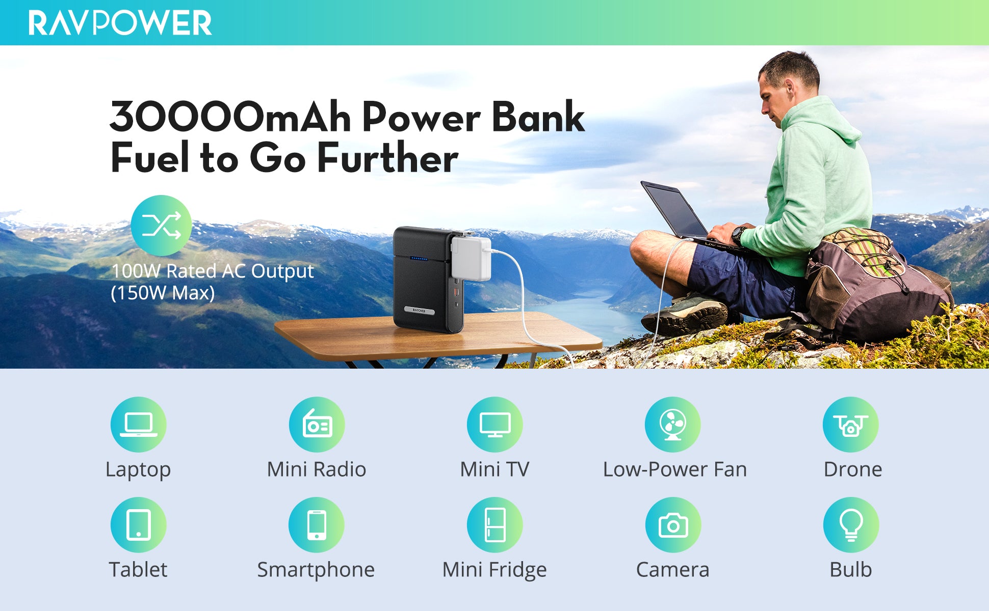 Introducing a new blueprint for power banks– the RAVPower 30000mAh power bank was forged with flexibility at the forefront, allowing users to power a much wider range of electronics. Power devices, at speeds up to 100W, from either the USB ports or the AC outlet; for 110V household appliances.
