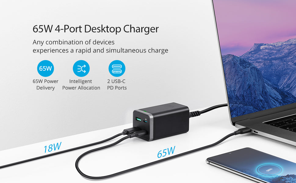 - Intelligent Power Allocation: Intelligently distributes 65W of power when charges 4 devices simultaneously, ensures all your connected devices get high-speed charging